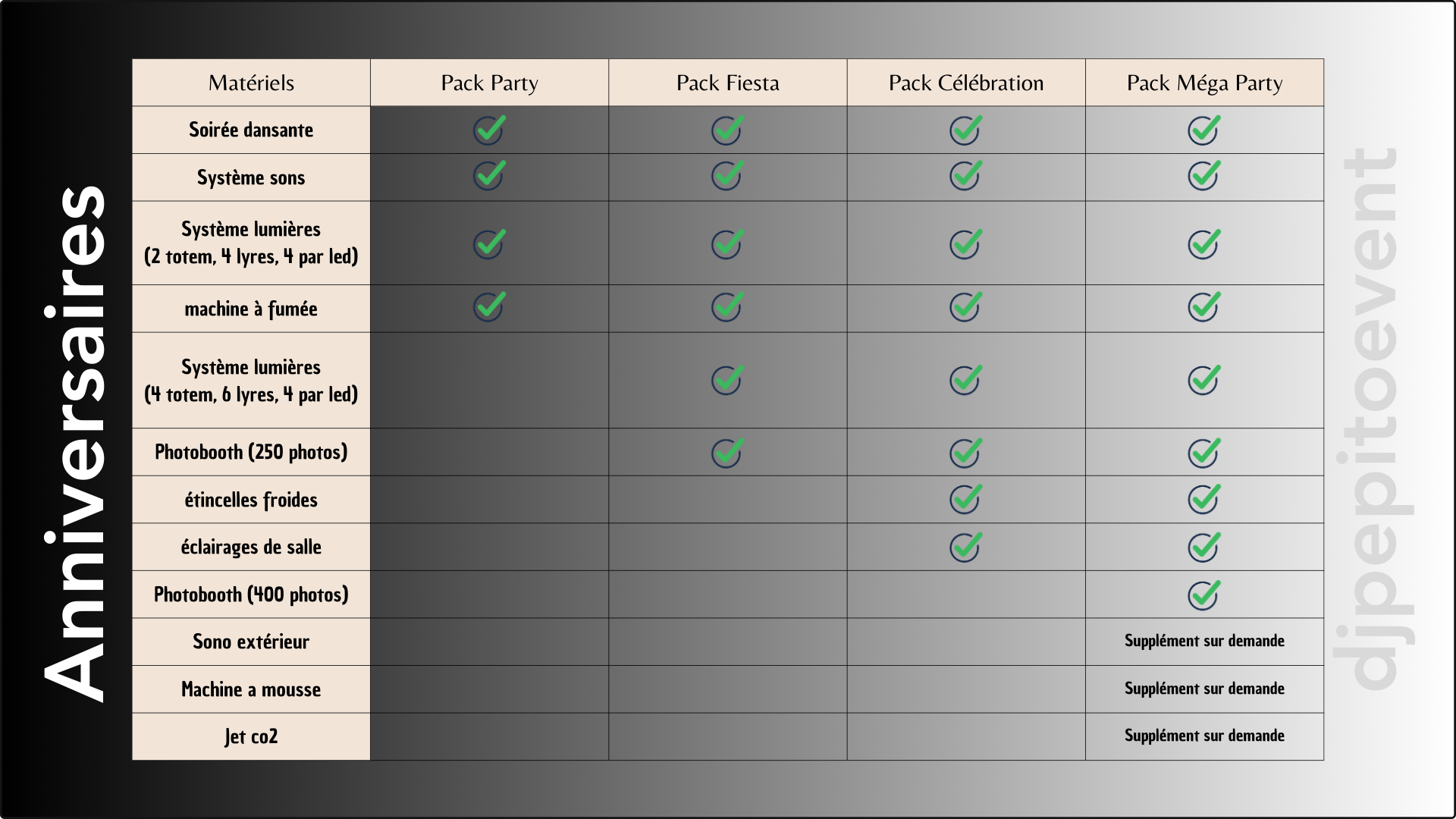 Le Pack Méga Party est l’expérience événementielle la plus complète. Il comprend tous les éléments nécessaires pour une soirée exceptionnelle : sonorisation professionnelle, éclairage puissant, photobooth avec 400 photos, étincelles froides et éclairage de salle pour une ambiance immersive. Des options supplémentaires peuvent être ajoutées sur demande comme la sonorisation extérieure, la machine à mousse ou les jets CO₂ pour un effet spectaculaire.
